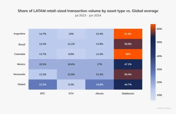 例如,根据 Chainalysis 一份 2024 年聚焦拉丁美洲的报告,在 2023 年至 2024 年间接收的总加密价值中,拉丁美洲占 9.1%,年使用增长率在 40% 至 100% 之间,其中超过 50% 是稳定币,这展示了发展中世界对替代货币的强劲需求。