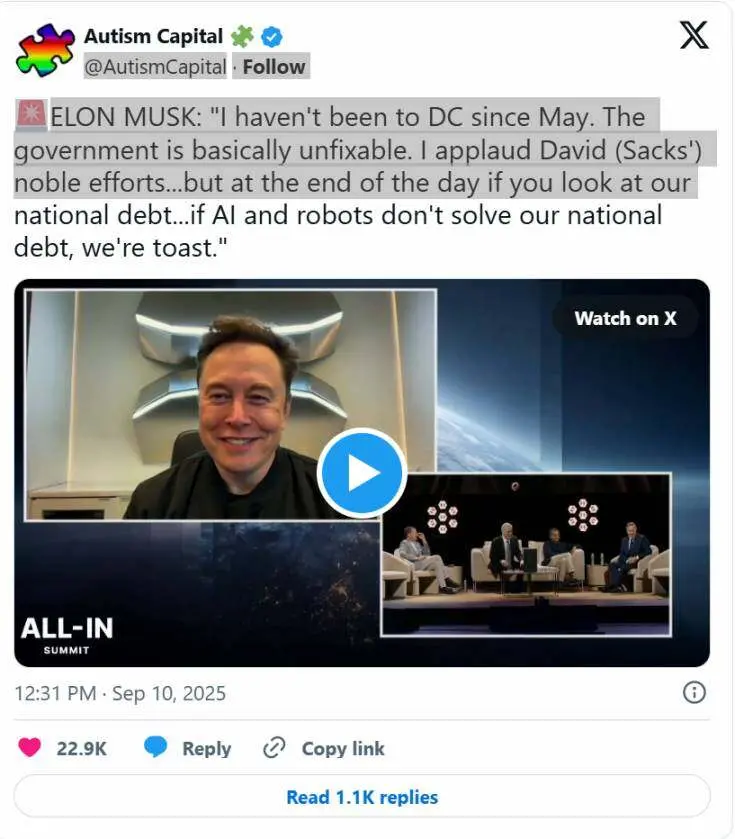 马斯克最近在一次峰会上露面时震惊了互联网,他说道:「我自五月份以来就没去过华盛顿。政府基本上是无可救药的。我赞赏大卫·萨克斯的崇高努力……但归根结底,如果你看看我们的国债……如果人工智能和机器人不能解决我们的国债问题,我们就完蛋了。」