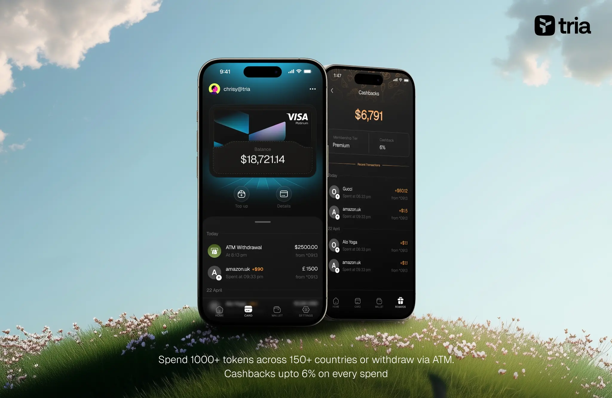 无论是在东京买杯咖啡,还是进行跨链代币兑换,Tria 都能实现即时、无缝且免手续费的交易。其 Visa 卡可在超过 150 个国家使用,并支持超过 1,000 种代币。交易通过 Tria 的 BestPath 引擎进行路由以获得最优执行,闲置资产还能赚取收益,并自动用于偿还卡片余额。