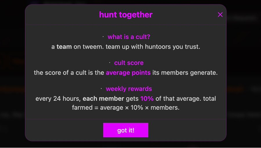 此外,Tweem还提供一个名为“Cult”(团队)的功能,允许用户与其他内容猎手组队寻找优质内容。团队成员可以平均分配积分。这可能形成某种“内容公会”,专注于策划特定主题的专业内容。例如,可以有专注于最佳Meme、最佳宏观分析或最佳预测市场洞察的团队“Cult”。