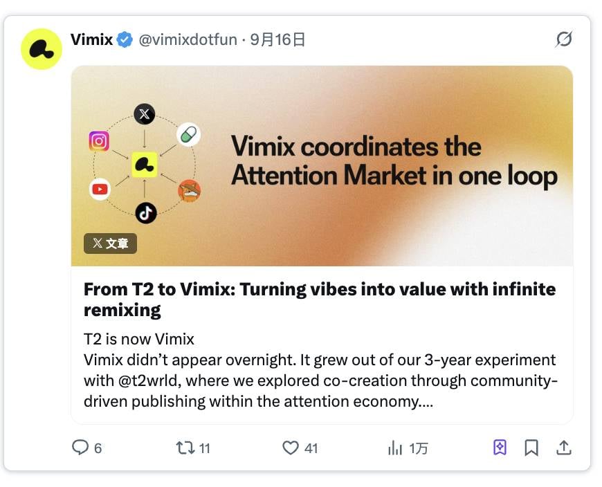 Vimix 是一个希望成为“注意力市场协调层”的协议,其核心理念是为一种特定的、高价值的策展工作——内容二次创作(remixing)构建市场。
