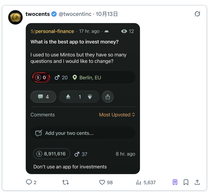 Twocents 是一个社交网络,其用户身份基于经过验证的净资产。虽然它本身不是一个策展市场,但它对解决当前社交媒体中零成本、(大多)匿名身份问题提供了有趣的思路。