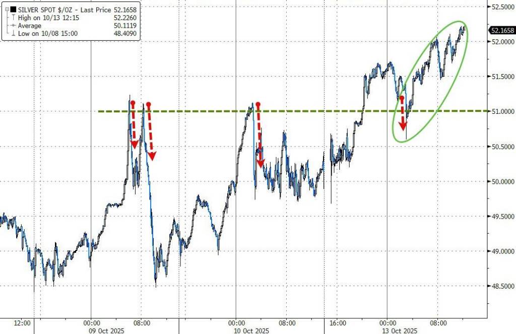 据彭博数据,伦敦现货白银价格一度上涨0.4%,触及每盎司52.5868美元的历史新高。这一价格超越了1980年1月在芝加哥期货交易所(现已不存在的合约)创下的52.50美元高点,当时德州亿万富翁亨特兄弟试图通过囤积白银来垄断市场。