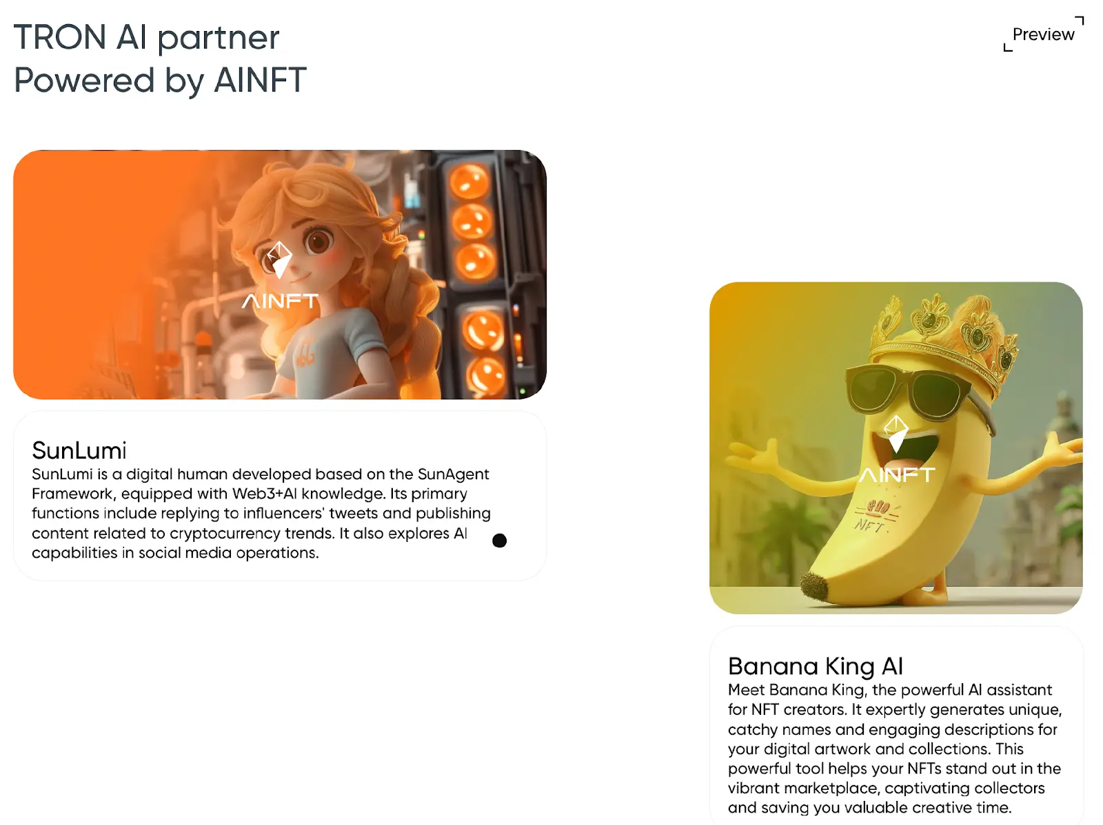 目前,AINFT的愿景已通过一系列生态创新项目得到生动展现:基于SunAgent框架的数字人SunLumi正以Web3 AI知识体系重塑社交媒体互动,不仅能智能回复推文,更能主动发布精准的加密货币趋势分析;专为NFT创作者打造的Banana King AI展现出卓越的创意赋能价值,它不仅能主动构思创意概念、深度挖掘项目内核,更能精准传递艺术价值,为NFT作品构建完整的叙事;而突破性的SunGenX智能化发币平台,更是将数字资产创建门槛降至新低,用户仅需一条推文即可在几分钟内完成Meme代币的链上部署。这些实践共同印证了AINFT生态的核心方向,即通过区块链的“可信底座”与AI的“智能活力”深度融合,稳步迈向一个智能、公平、自主的数字新纪元。