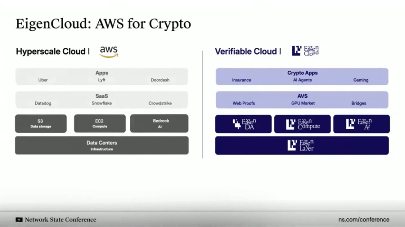 就像 AWS 云一样,@eigenlayer 正在为一切提供可验证的云基础设施。Eigen 不是将所有东西托管 / 运行在中心化服务器上,而是支持链下计算,同时在链上验证结果 / 推理。