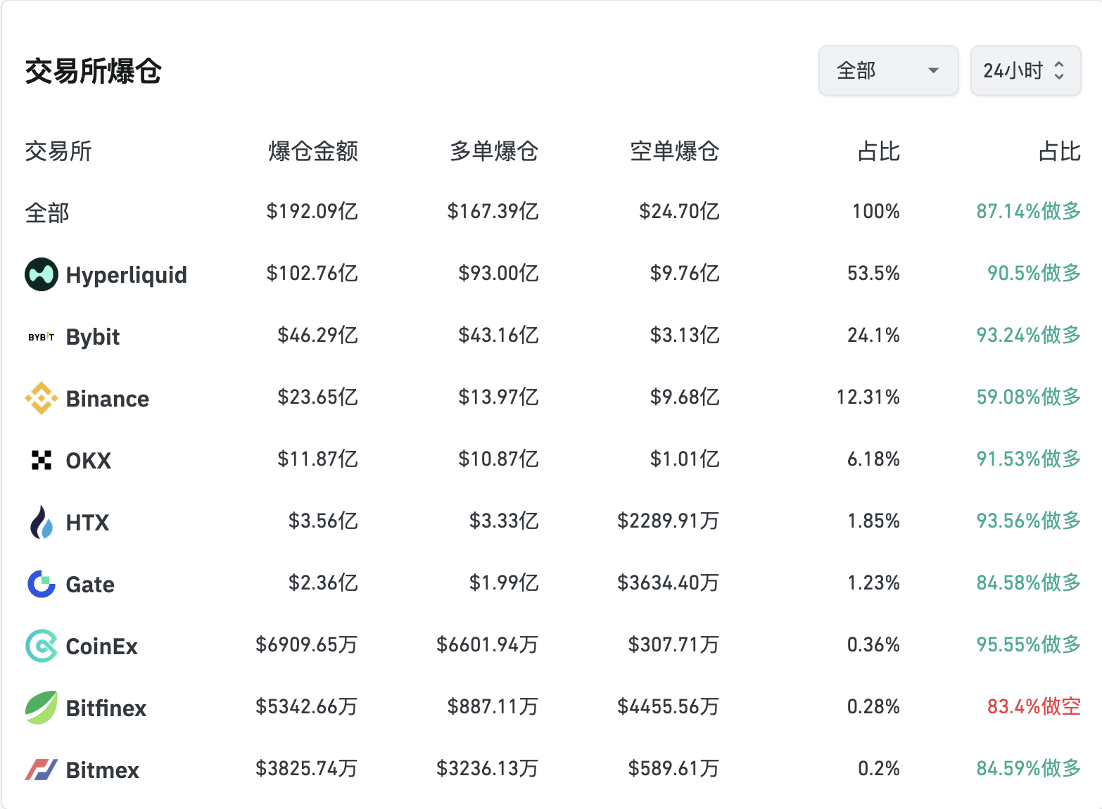 Coinglass 数据显示,截至 11 日 9 时,24 小时爆仓额达到 192 亿美元,爆仓人数达 164 万人,最大单笔爆仓单超 2 亿美元。