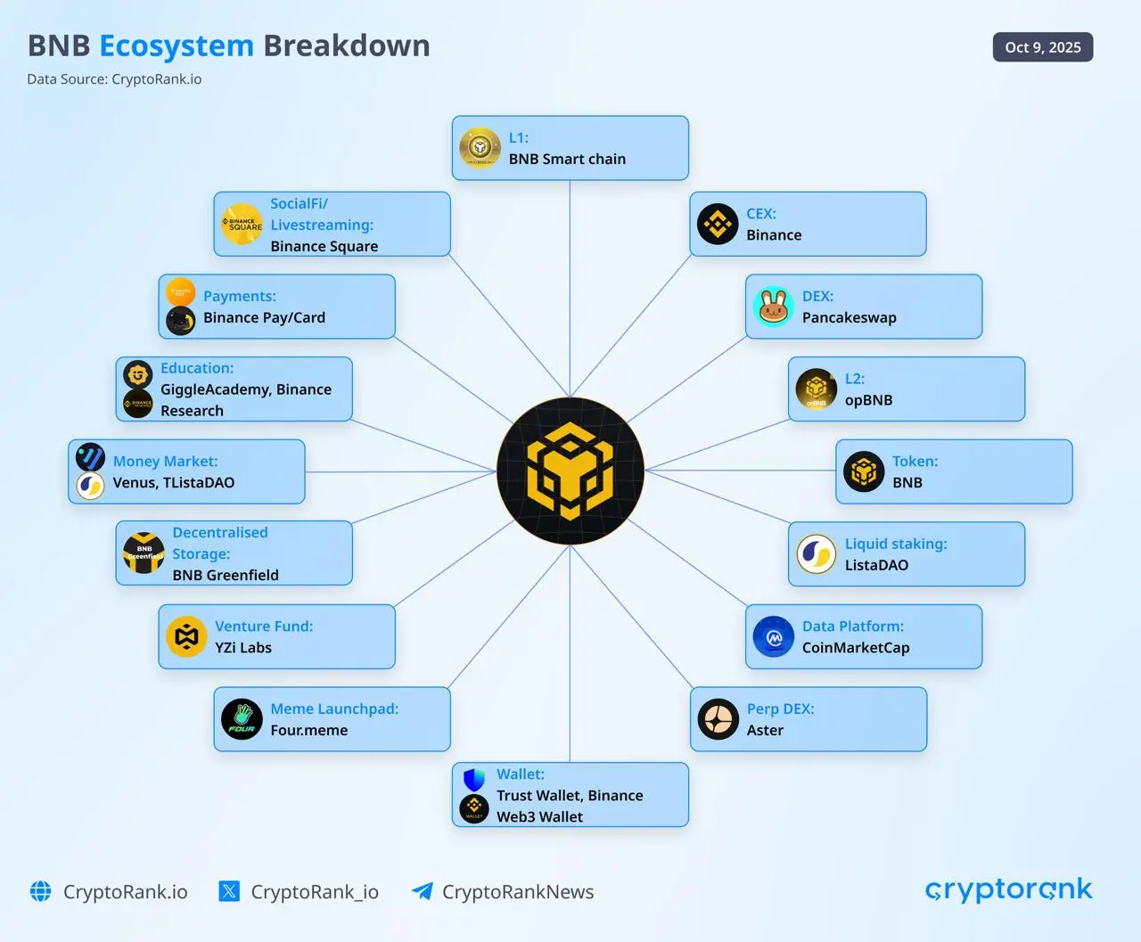 在过去一年中,BNB 链再次展现出其在全球公链生态中的统治力。从 CryptoRank 发布的最新 BNB Ecosystem 图谱可以看到,这条链已经不再只是一条“交易链”,而是在多个核心赛道形成了