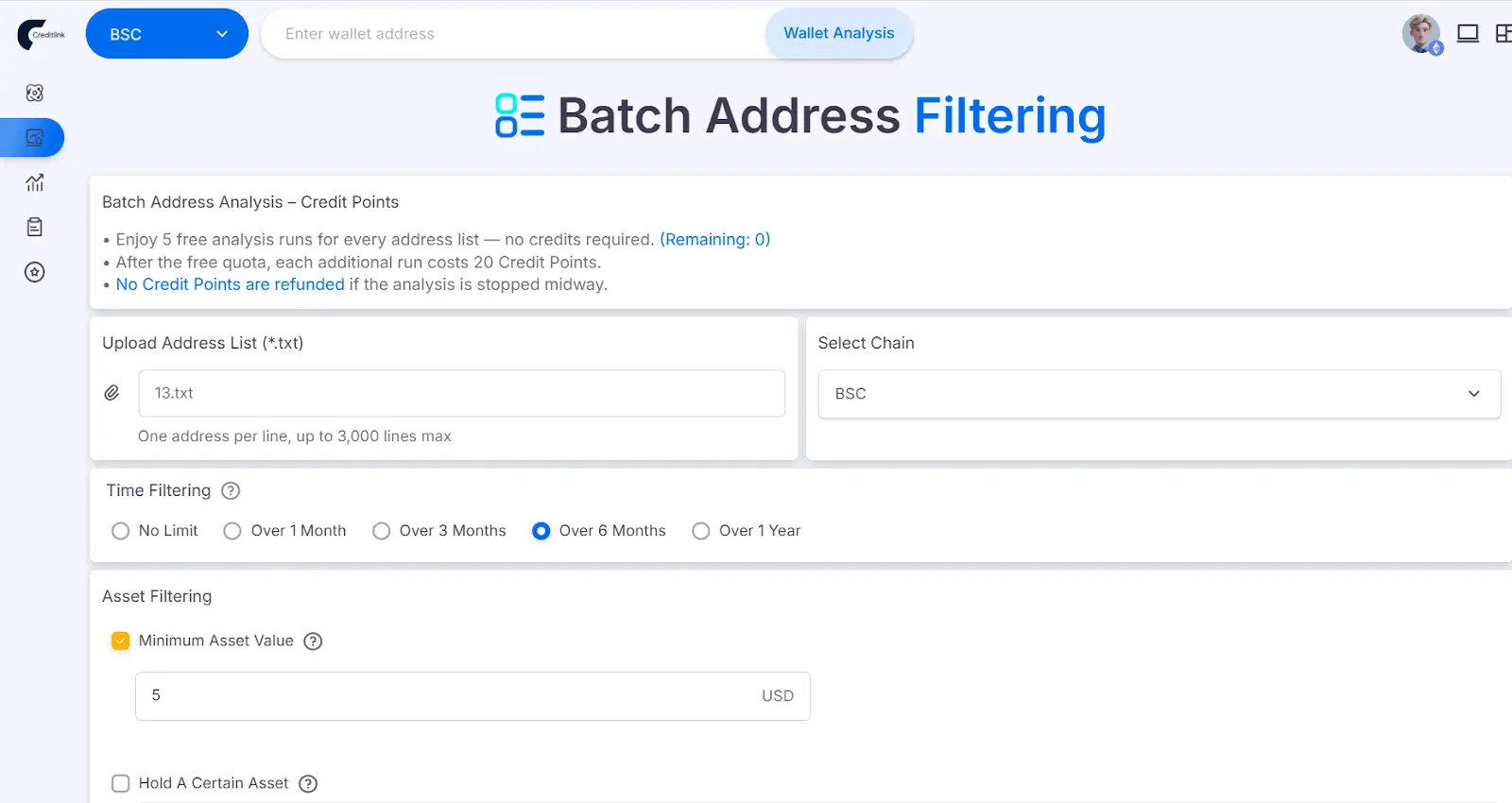Creditlink 支持用户一次性上传数百乃至上千个钱包地址,并通过自定义条件(如区块链网络、钱包创建时间、余额下限、是否收过空投、是否与特定合约交互等)进行快速筛选。