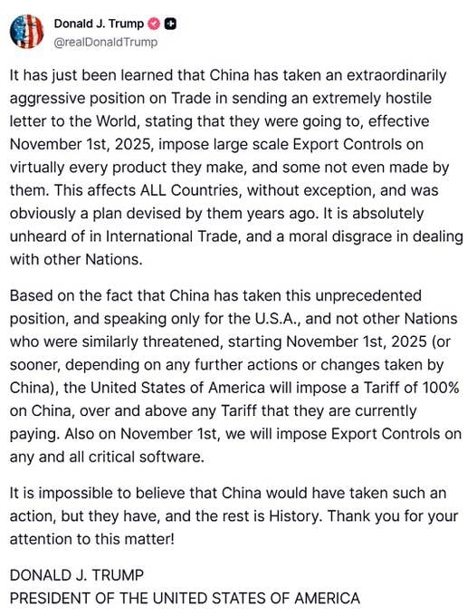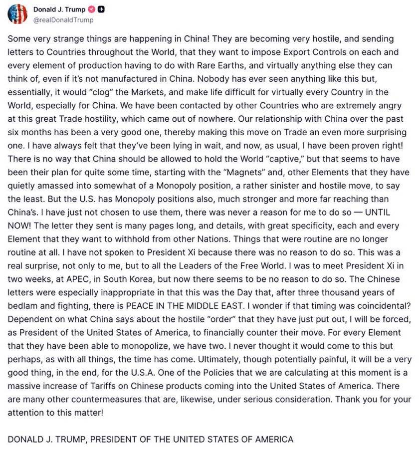 美国总统特朗普在社交平台 Truth Social 上发文,提到可能对来自中国的商品征收“大规模”的新关税。