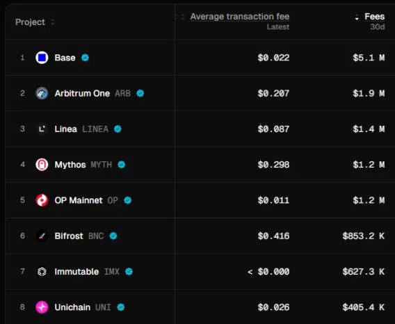 Layer 2 面临一个基本的经济挑战:保持低交易费用的竞争压力削弱了收入能力。Base 拥有 49.5 亿美元的 TVL、100 万日活用户和 510 万美元的月交易费用,其主要原因在于它们与 Coinbase 的原生连接、平均交易仅 0.02 美元的竞争性低费用,以及与更广泛的基于 EVM 的生态系统的深度集成。