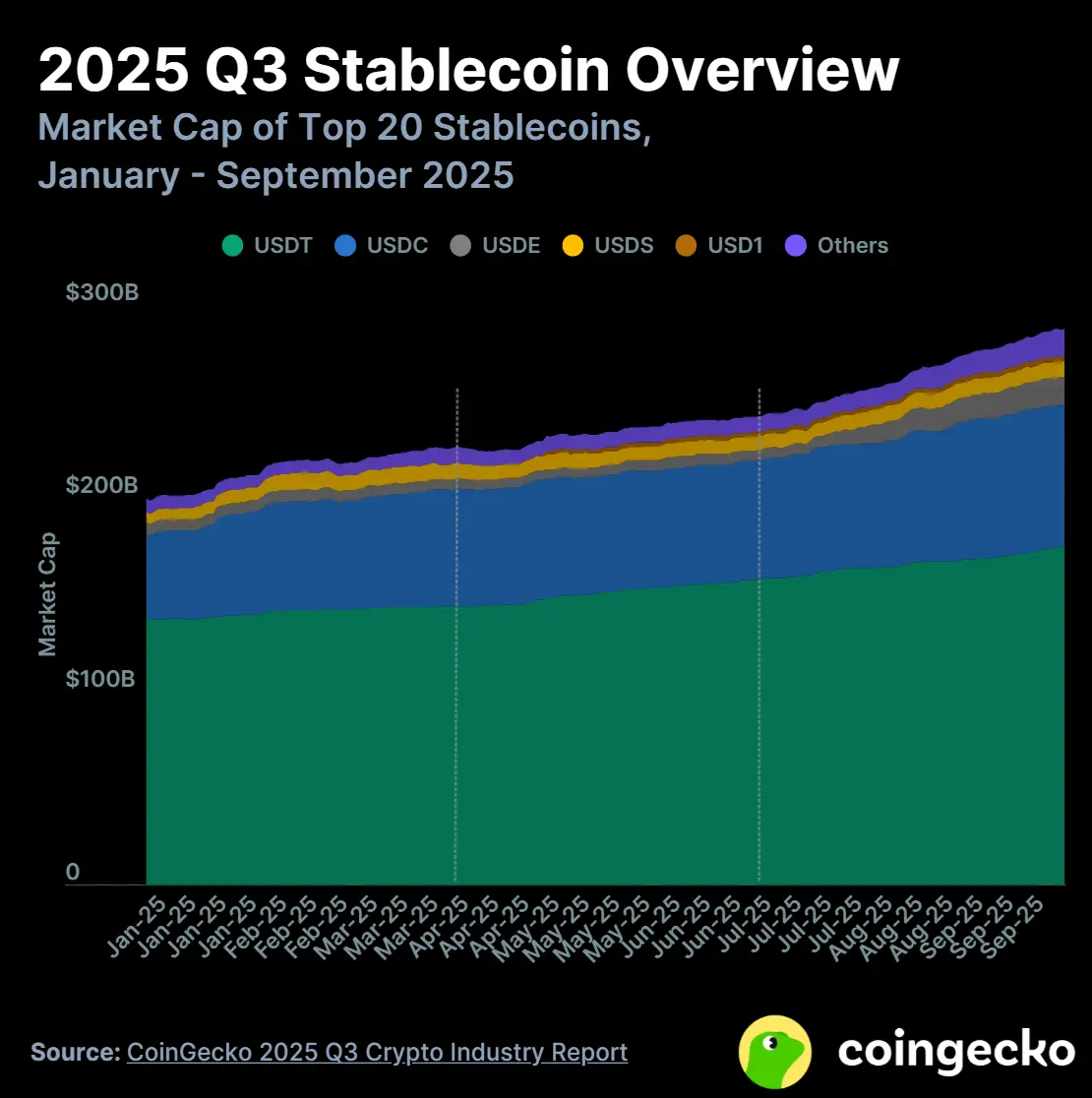 2025 Q3 前 20 大稳定币总市值增长 18.3%( 445 亿美元),至 2,876 亿美元,并在 Q4 初继续上升突破 3,000 亿美元。