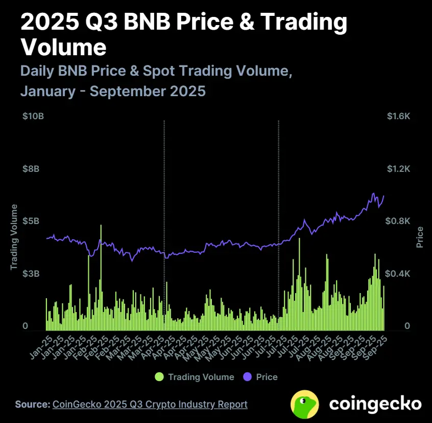 BNB 在 2025 Q3 收于 $1,030( 57.3%),并在进入 Q4 后继续攀升至 $1,369 的新高。