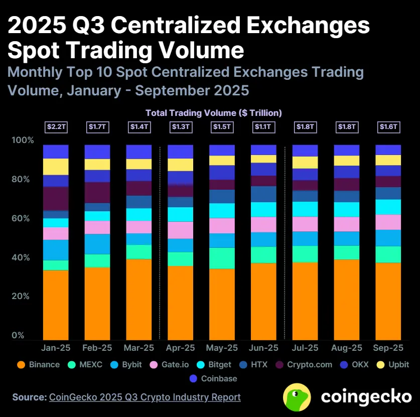 中心化交易所(CEX)现货交易量环比增长 31.6%,达 5.1 万亿美元,其中 Binance 与 Bybit 领跑市场。