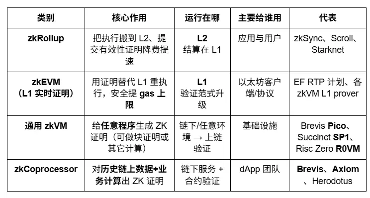 而在以太坊生态之外,零知识证明(ZKP)技术也延伸至更广泛的 通用可验证计算(Verifiable Computing) 领域,形成以 zkVM 与 zkCoprocessor 为核心的两类技术体系。