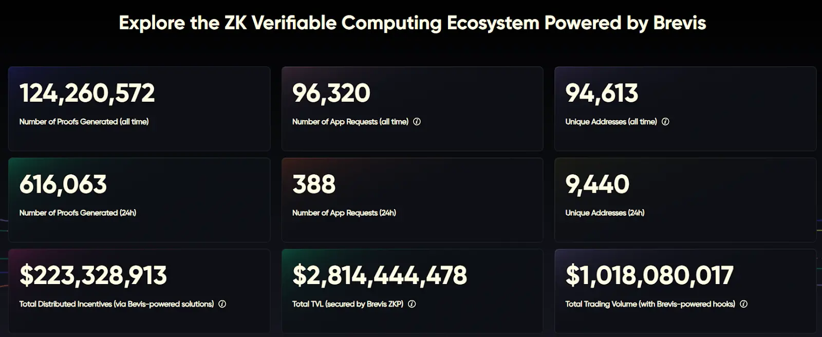根据Brevis Explorer 数据,截至 2025 年 10 月,Brevis 网络 已累计生成超 1.25 亿条 ZK 证明,覆盖 近 9.5 万个地址、9.6 万次应用请求,广泛服务于奖励分发、交易验证与质押证明等场景。生态层面,平台累计分发激励约 2.23 亿美元,支撑的 TVL 超 28 亿美元,相关交易量累计突破 10 亿美元。