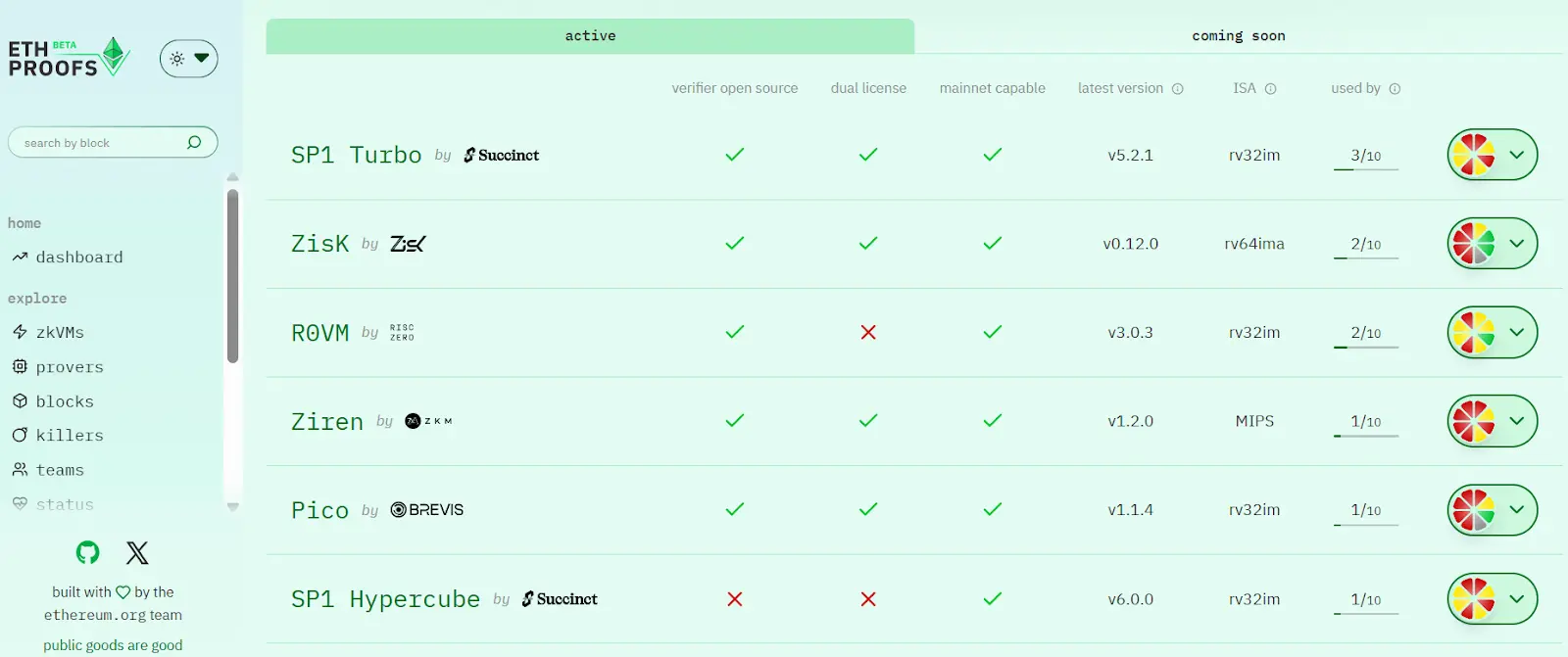 目前,以太坊基金会支持的ETHProofs.org 已成为 L1 zkEVM 实时证明(Realtime Proving, RTP)路线的核心追踪平台,用于公开展示各 zkVM 的性能、安全与主网适配进展。