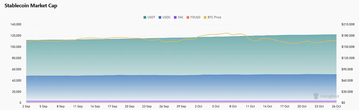 盛宴与隐忧:政策利好能否支撑市场穿越波动?Hotcoin Research | 2025 年 10 月 20 日-24 日当前,加密货币总市值为 3.75 万亿美元,BTC占比 59.1%,为 2.21万亿美元。稳定币市值为3083亿美元,最近7日增幅0.39%,稳定币数量持续增长,其中USDT占比59.27%。 Coi