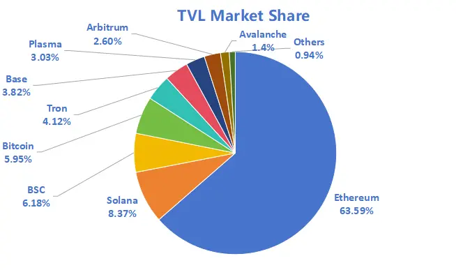 据DeFiLlama的数据,本周DeFi总TVL为1,575亿美元,较上周1,522亿美元,本周涨幅为3.48%。按公链进行划分,其中TVL最高的三条公链分别是Ethereum链占比63.59%;Solana链占比8.37%;BNBChain占比6.18%。