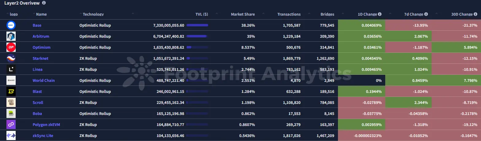 Base和Arbitrum分别以38.26% 和35% 的市场份额占据前排,本周Base依然在以太坊Layer2的TVL中位居第一。