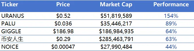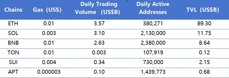 从链上数据看,日成交量中本周整体呈下跌趋势,仅Toncoin上涨16.3%,其中,Sui跌幅最为显著,较上周下跌41.5%,Ethereum下降27.8%、Solana下降19.7%、BNBChain下降7.2%、Aptos与上周持平;交易费用上,整体网络成本保持稳定,除Solana较上周上涨200%,其余公链和上周持平;日活跃地址上,本周Aptos表现最为强劲,较上周上涨44.4%、Solana上涨1.9%、Ethereum上涨3.5%、BNBChain下降5.2%,Toncoin下降7.4%,Sui降幅最大,达13%;从TVL来看,本周则呈全面增长态势,Toncoin增长显著,较上周上涨11.1%,其余大部分公链都有约3%–8%的增长幅度。