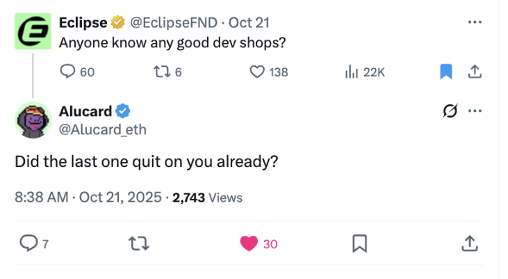我不会强调 Eclipse 的代币价格或任何进一步的推文,但我确实觉得这有点可笑。Eclipse 从一开始就注定失败,因为它的意图从来不是以长期愿景来运营一个区块链,它始终是抽取流动性。