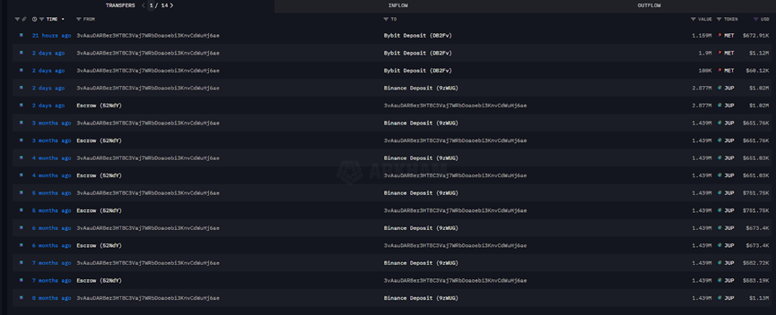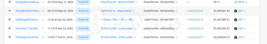 过去8个月,通过该地址抛售的JUP代币数量超过3000万枚。