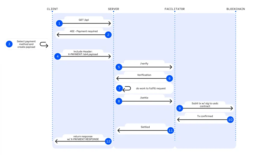 服务器将支付信息传递给一个“Facilitator”(促进者),由其验证支付并在区块链上处理交易。