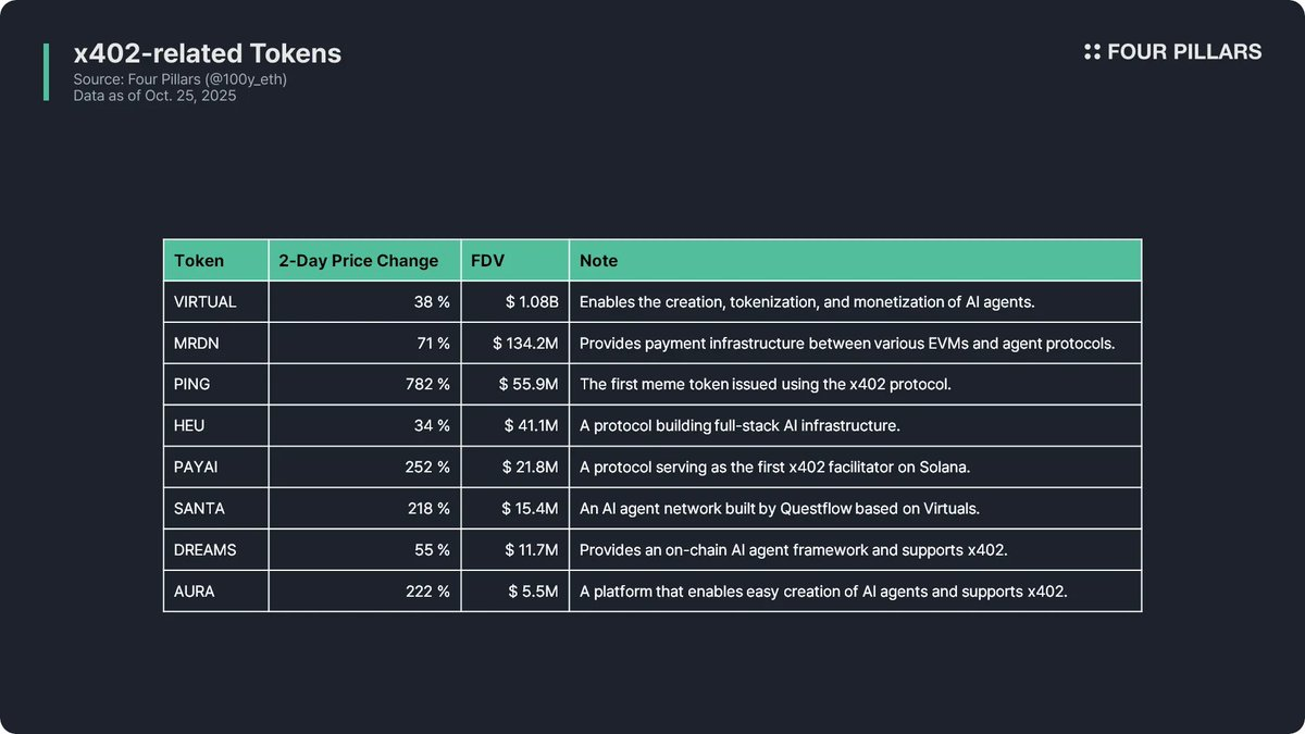 x402进入炒作阶段最明显的迹象是相关代币价格的急剧上涨。例如,每当AI代理话题重新浮现时都会有所反应的代币 $VIRTUAL,仅两天内就上涨了40%,其他相关代币也出现了大幅价格增长,如下图所示。
