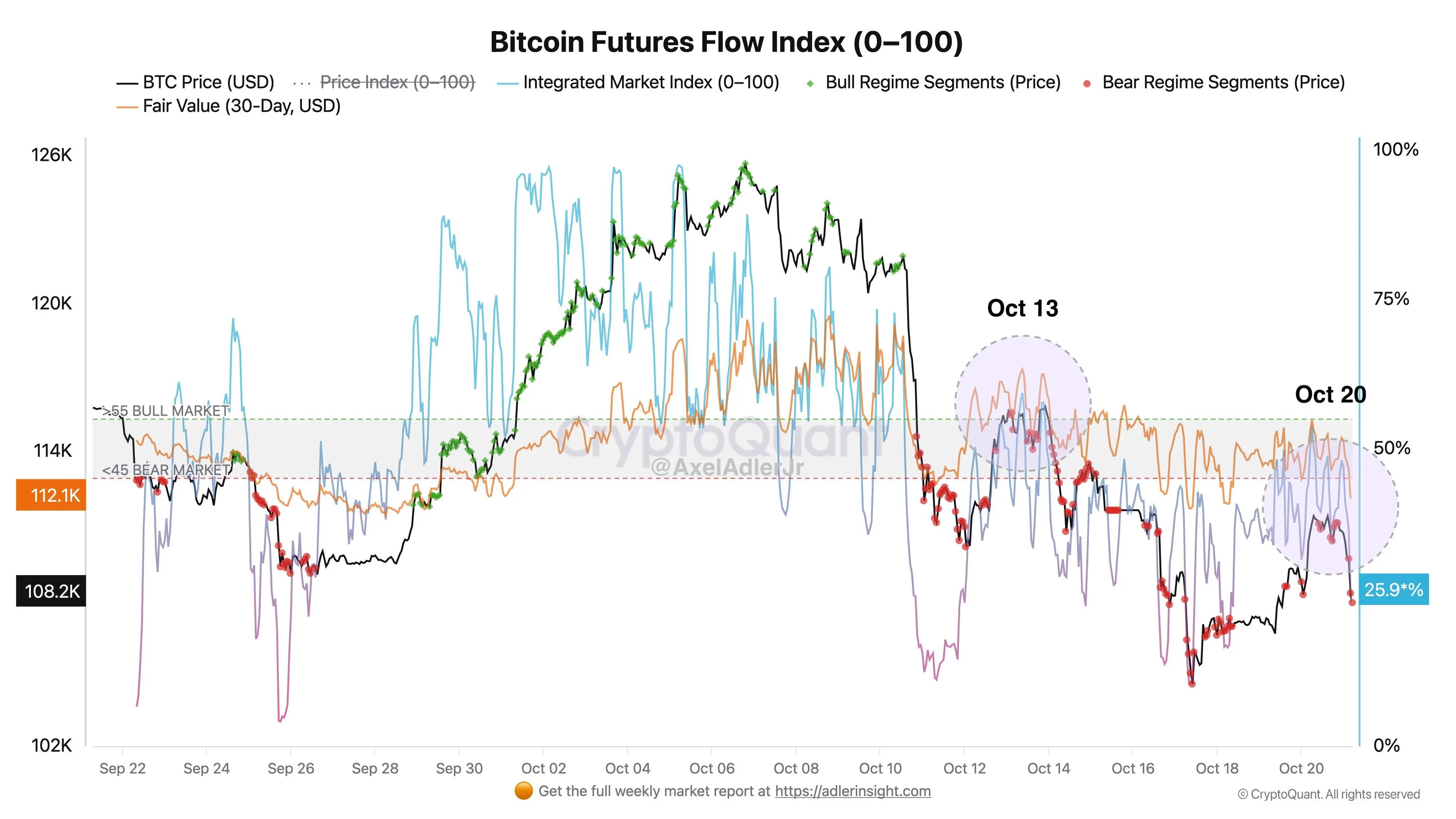 CryptoQuant 分析师 Axel Adler Jr 指出,比特币期货流动指数低于 45,表明市场仍处于流动性不足的弱势区间。多头力量在尝试重夺主导地位时屡遭失败,目前价格仍低于 30 日公允价值,显示买方主动性减弱。与此同时,比特币未平仓合约(Open Interest)下降约 30%,意味着市场中过度杠杆的部分已被清除。