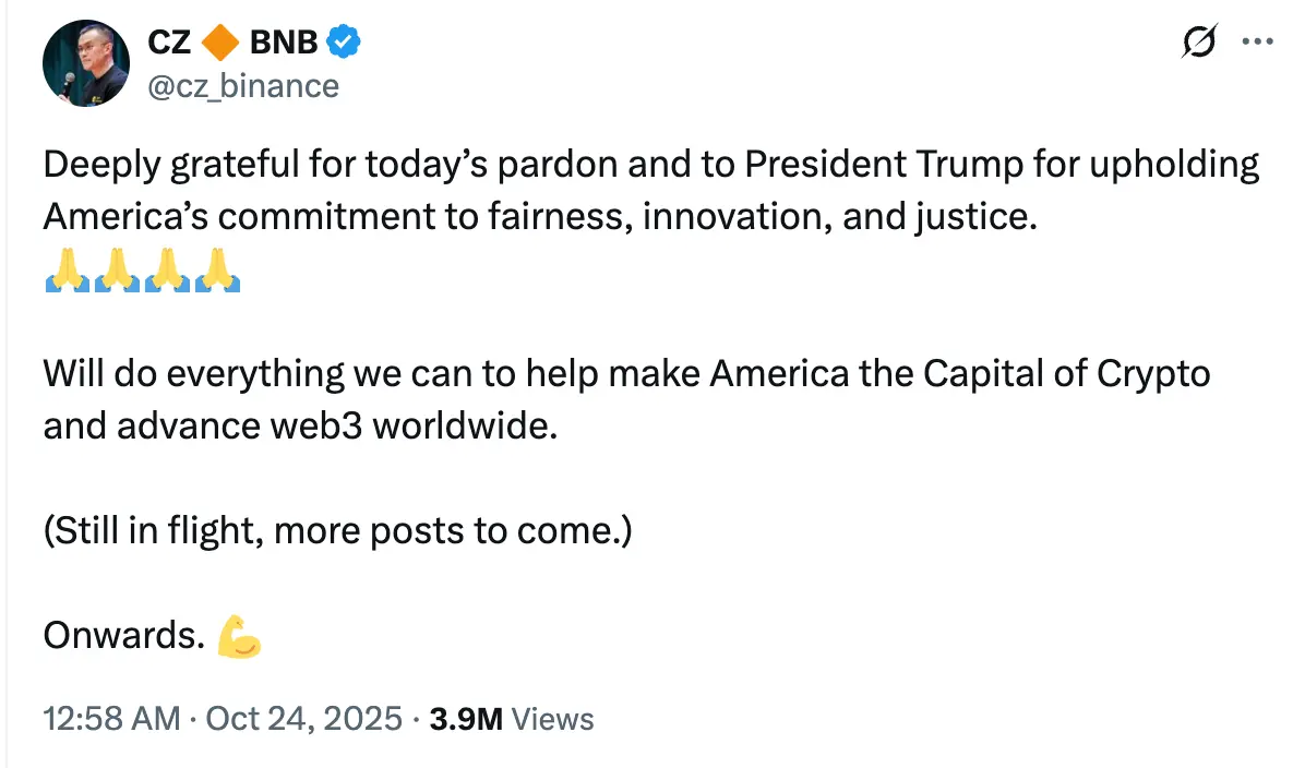 随后,币安创始人 CZ 在社交媒体平台发文表示,对今日获得的赦免以及特朗普总统维护美国对公平、创新和正义的承诺深表感谢。他将尽一切努力帮助美国成为加密货币之都,并推动 Web3 在全球的发展。
