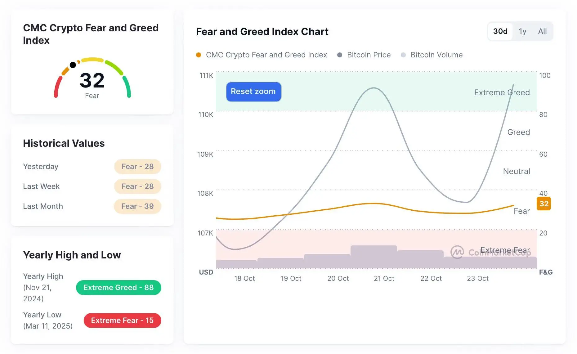 回顾本周(10月18日–10月24日),恐惧与贪婪指数每日值分别为:25(恐惧)、27(恐惧)、30(恐惧)、33(恐惧)、29(恐惧)、28(恐惧)、32(恐惧)。整体区间运行于 25–33 点,持续位于“恐惧”区域,显示市场短期情绪波动有限,投资者情绪整体谨慎但略有回升。