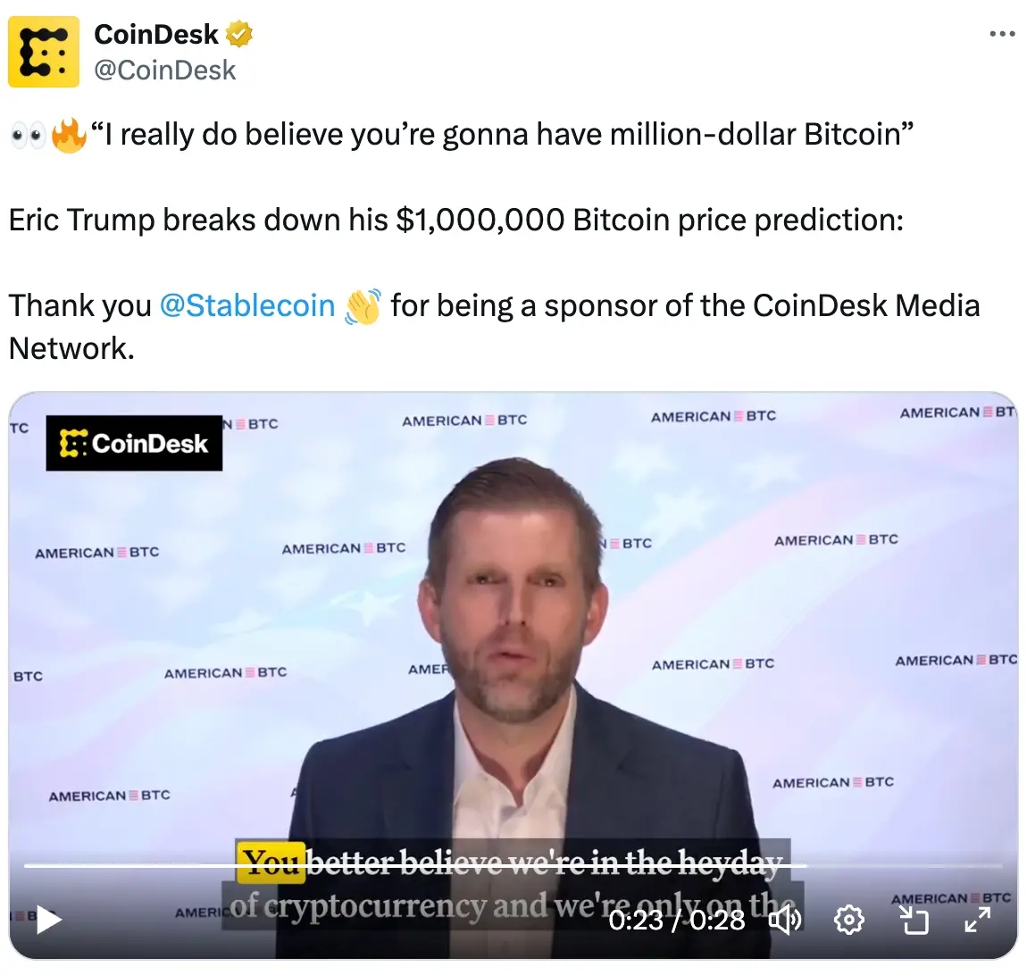 Eric Trump:比特币第四季度将迎来惊人表现,未来或涨至百万美元