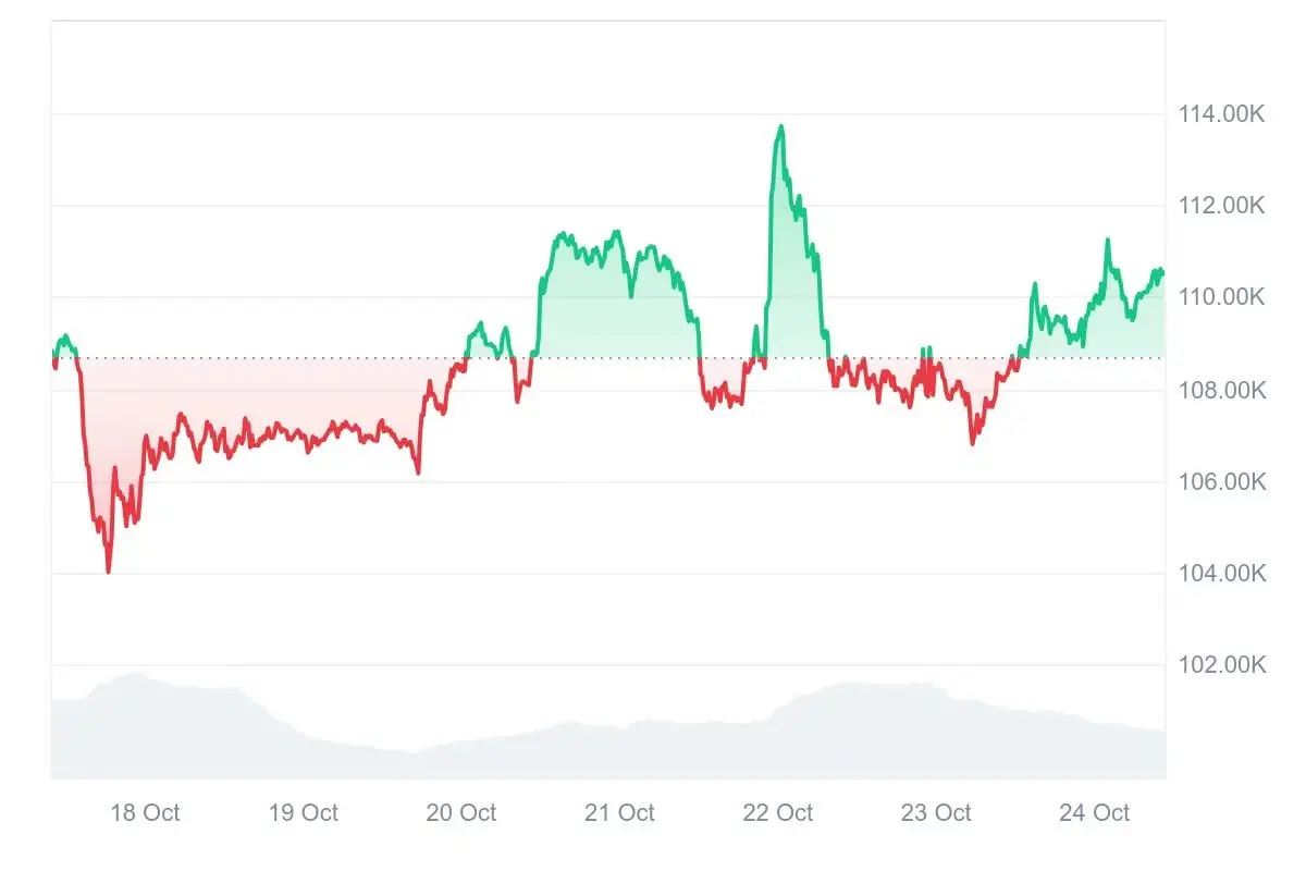 过去一周(2025年10月18日至10月24日),比特币整体运行节奏表现为 “横盘整理 → 震荡攀升 → 短线突破 → 企稳回升”。价格主要运行区间维持在 $106,000 – $114,000 之间,整体波幅约 7.5%,期间多空力量频繁交替。