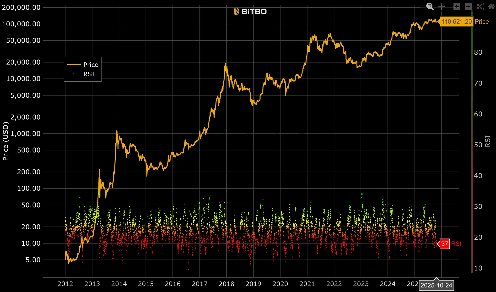根据 Bitbo 数据,截至2025年10月24日,比特币 14 日 RSI 为 37 。该数值处于技术性“超卖”临界区(一般 RSI<30 为超卖,RSI>70 为超买)。RSI 在中低位徘徊表明市场尚未恢复强势,但下行空间相对有限。短期或进入“技术性修复反弹”阶段,若 RSI 能进一步突破 45 上方,将有望确认短期底部结构。