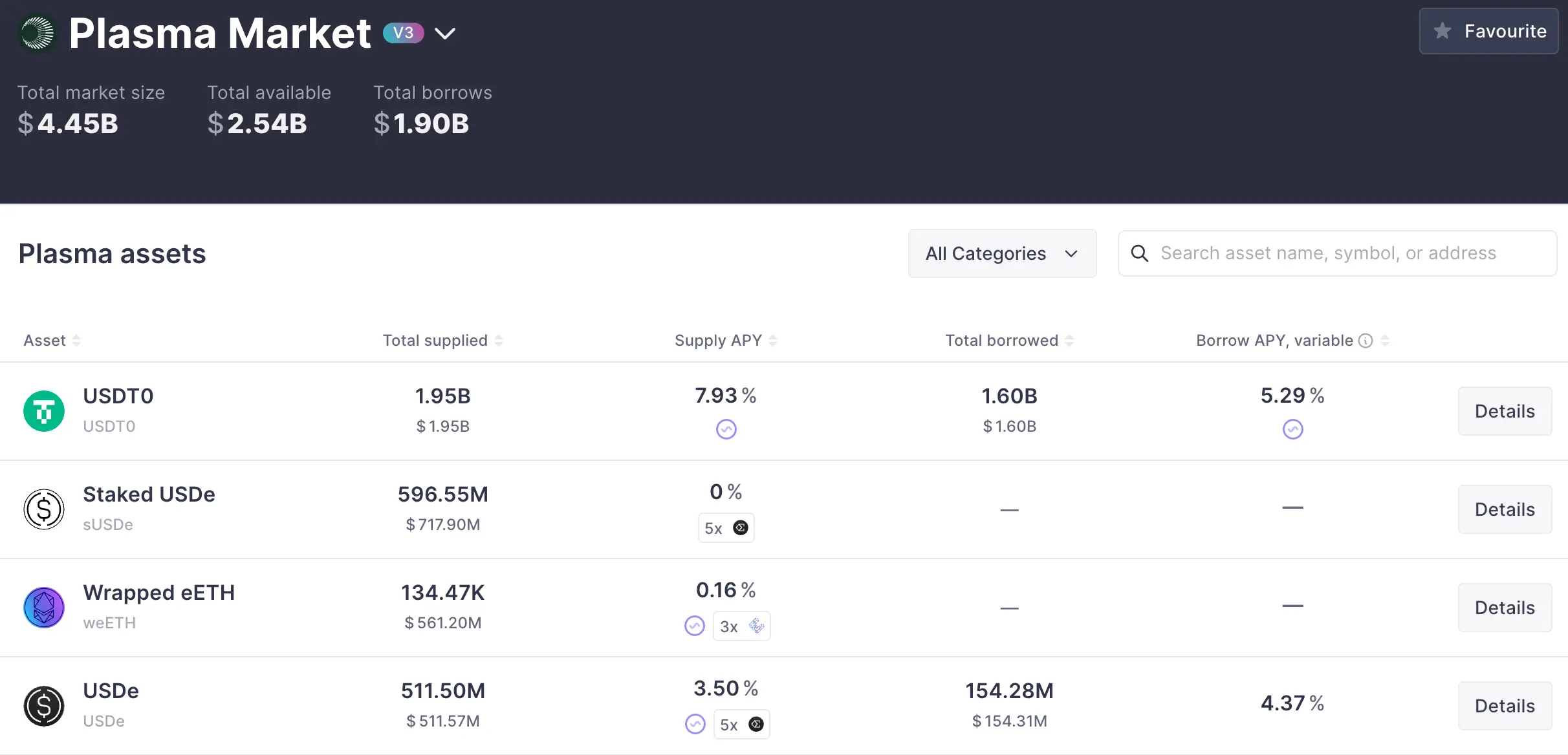 Figure 7. AAVE Plasma Market. Source: https://app.aave.com/markets/?marketName=proto_plasma_v3