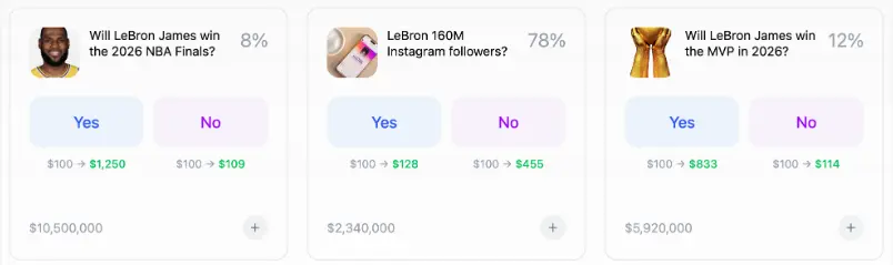 「勒布朗·詹姆斯在本月底前是否会拥有超过 X 百万粉丝?」;「勒布朗·詹姆斯是否会在 2026 年赢得总冠军?」;「勒布朗·詹姆斯是否会在 2026 年获得 MVP?」
