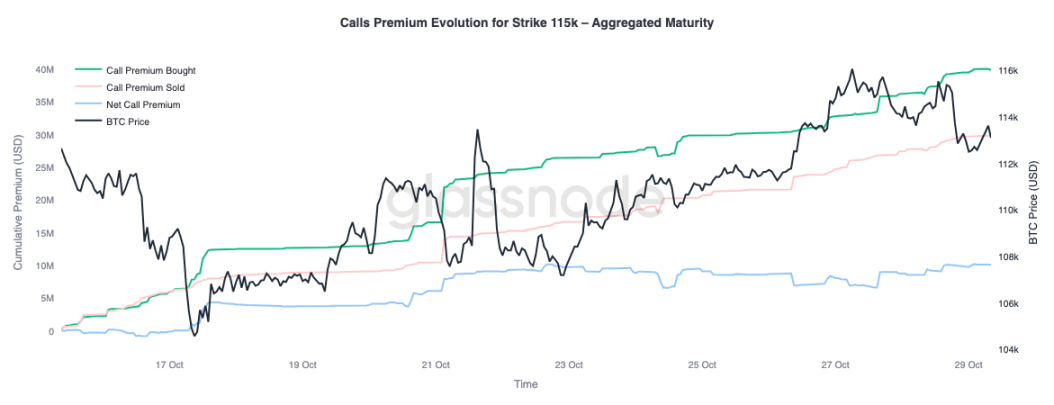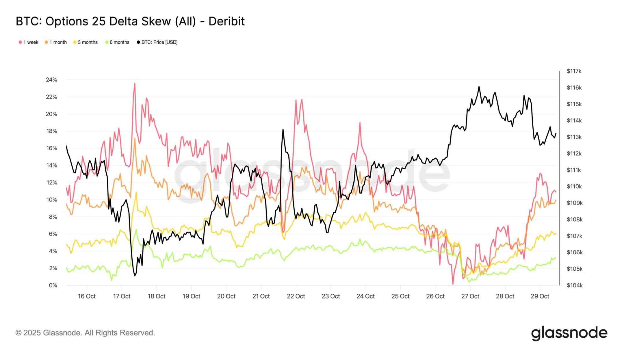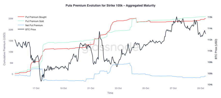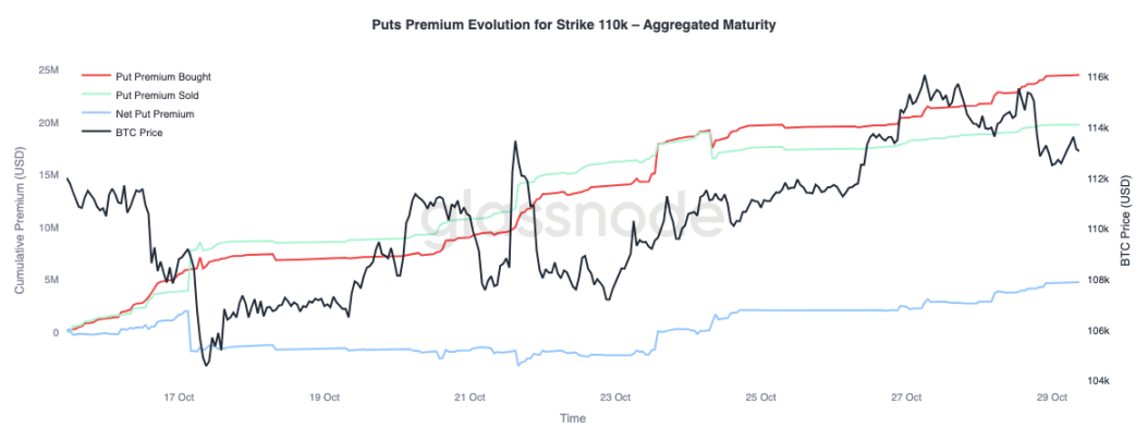 为了完善整体情况,我们可以转向市场的看跌期权方面。自 10 月 24 日以来,随着比特币推高,交易者一直在买入 11 万美元看跌期权,表明对近期下行保护的需求。与此同时,10.5 万美元看跌期权被更积极地卖出,表明参与者乐于通过在该较深行权价提供保险来收取权利金。