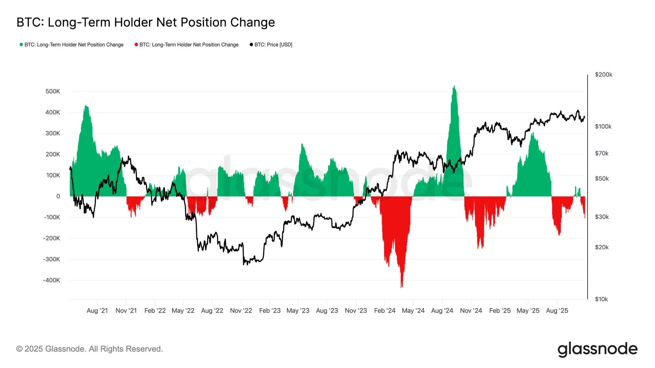 基于先前的观察,长期持有者的持续抛售继续拖累市场结构。长期持有者净头寸变化已降至每月 -10.4 万 BTC,凸显了自 7 月中旬以来最显著的一波抛售潮。