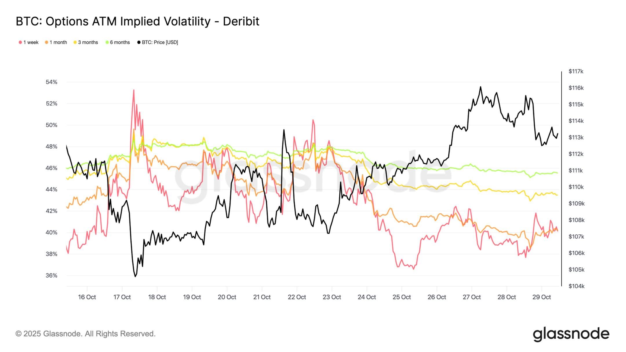 转向期权市场,近期数据显示,10 月 10 日暴跌后的波动率压力继续缓解。比特币的 30 天已实现波动率已降至 42.6%,较上周的 44% 略有下降,反映出价格走势更为平静。与此同时,代表交易者预期的隐含波动率下降更为剧烈,因为参与者解除下行对冲并减少保护需求。