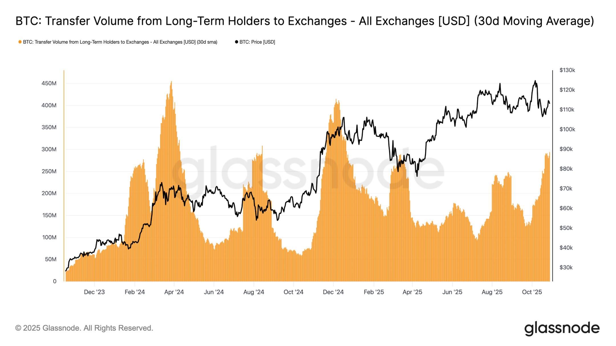 为了衡量长期持有者抛售的强度,我们可以转向长期持有者转移到交易所的转账量(30 日简单移动平均线),该指标捕捉了经验丰富的投资者为潜在出售而转移的代币价值。该指标已飙升至每天约 2.93 亿美元,是自 2024 年 11 月以来普遍存在的 1 亿至 1.25 亿美元基准水平的两倍多。