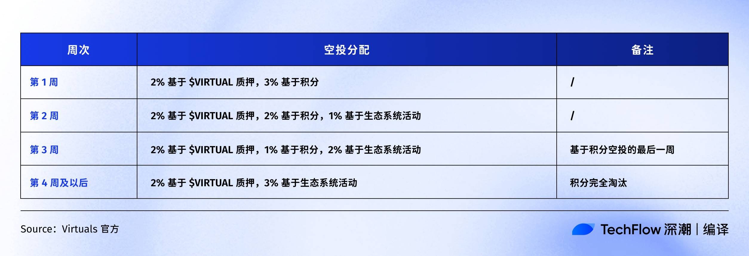 在过渡期内,所有现有积分仍将根据持有积分数量生成空投,同时还将基于 $VIRTUAL 质押和 Virtuals 生态活动获得奖励。