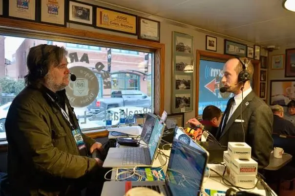 (图为 2016 年 2 月,班农(左)在他的播客上采访时任特朗普高级顾问 Miller)