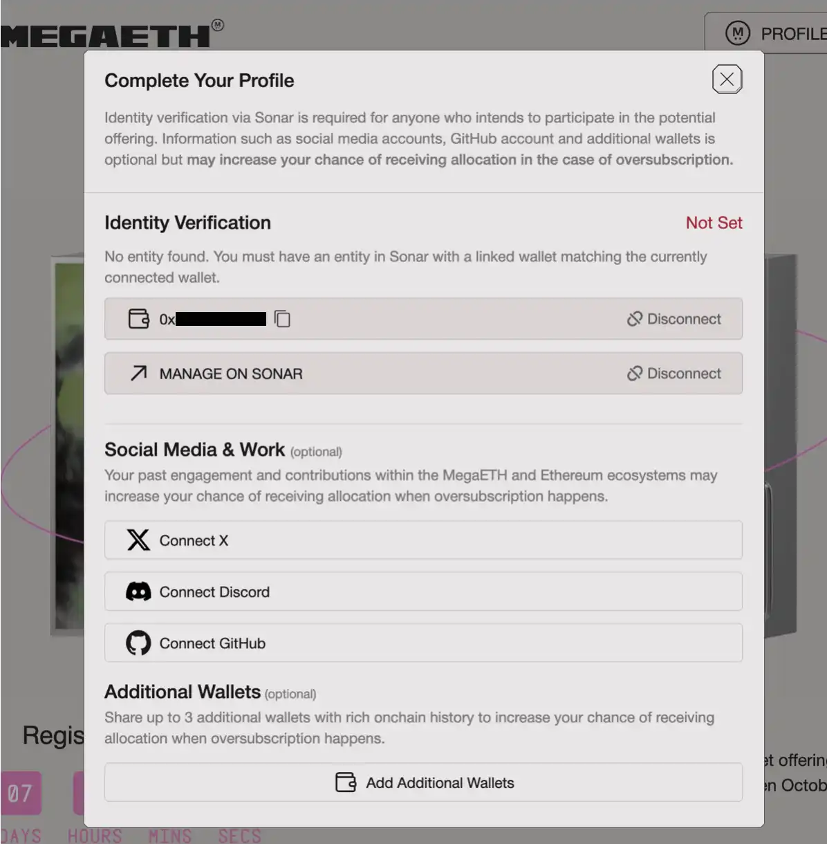 Sonar 上目前最火的 ICO 是 MegaETH,10 月 15 日至 10 月 27 日期间处于注册时间,注册截止时间还有 6 天。完成 KYC 身份验证步骤比较多,但在资料完善且顺利的情况下几乎是秒通过的,如果需要等待的话则是在进行人工审核,需要等待至少 1-3 天,因此尽早完成 KYC。