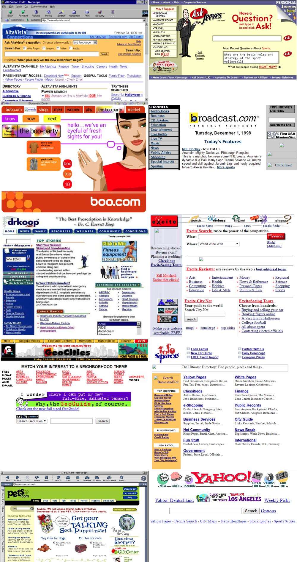 认出来了吗?可能不会。这些是属于早期互联网公司在“互联网泡沫”时代的老旧主页。当然,这些页面与我们今天所熟知和喜爱的互联网完全不同。