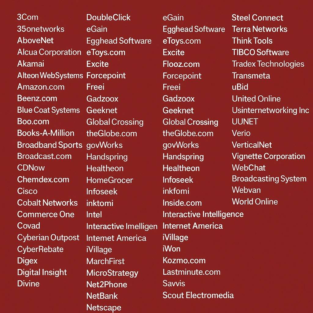 以下是一些在互联网泡沫破裂后失败的上市互联网公司,数据来源于维基百科: