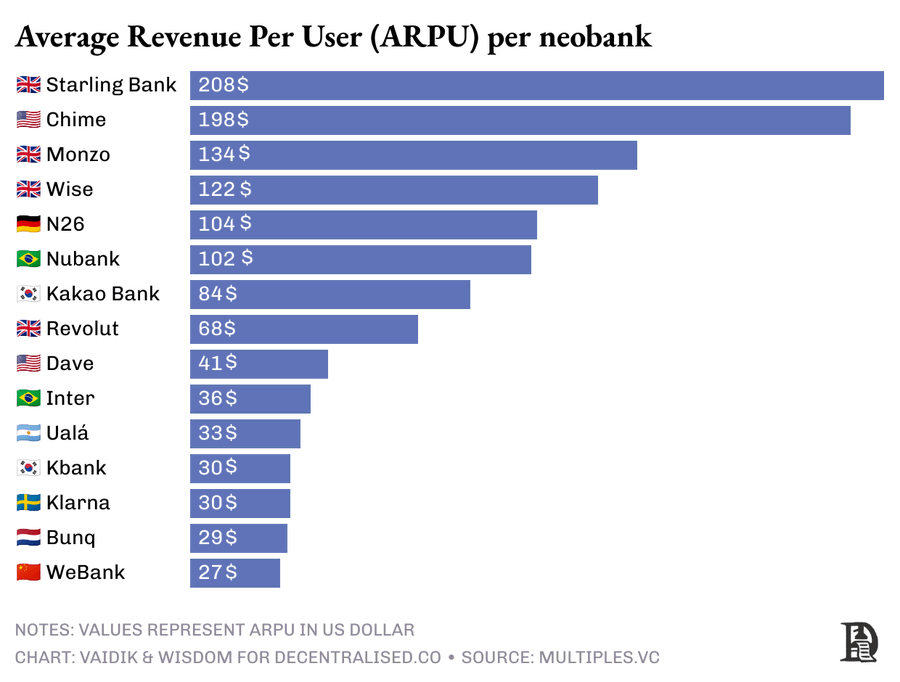 正因如此,在全球最大的 15 家新型银行中,有 9 家每年每用户的收入仍然不足 100 美元。