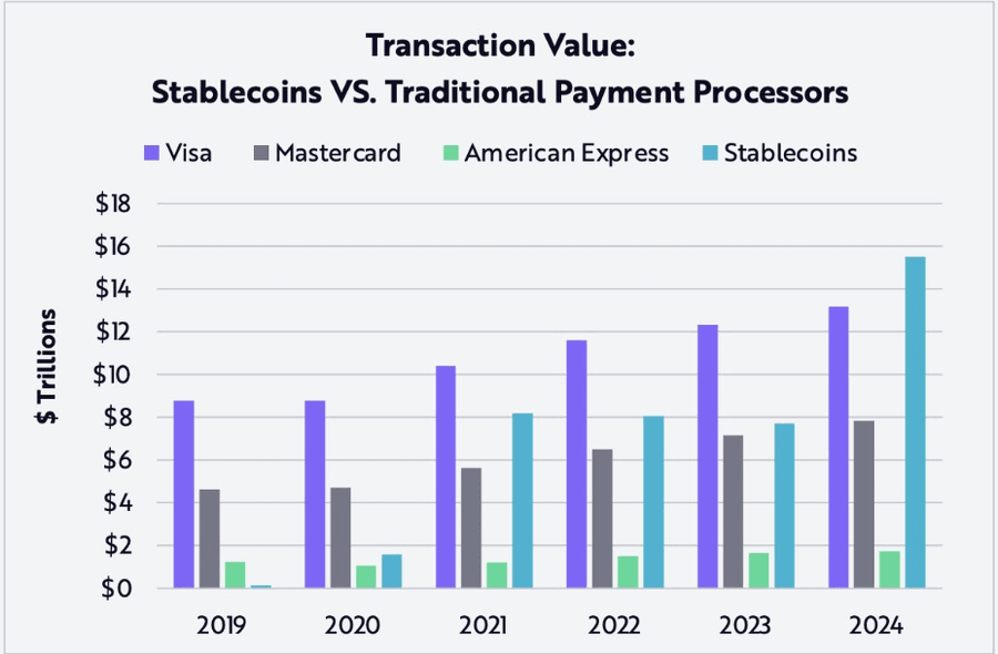 根据 ARK Invest 的《BIG IDEAS 2025》报告,稳定币在 2024 年的结算金额超过 15.6 万亿美元,比万事达卡和美国运通的总和还要多。
