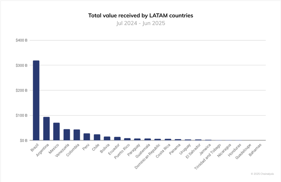 根据 Chainalysis 的数据,去年拉丁美洲的加密货币流入总额超过 1.5 万亿美元,仅巴西就达到了 3190 亿美元,其中近 90%来自用于储蓄、工资和汇款的稳定币。