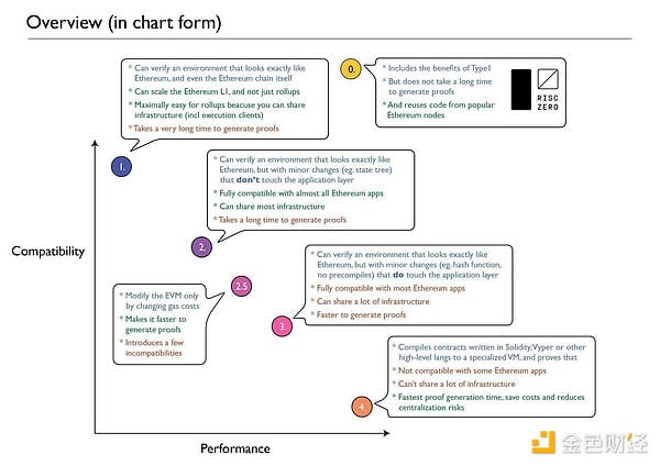 以太坊联合创始人 Vitalik Buterin 在文章「Different types of zk-EVMs」将 zkEVM 分为了四类,其中 Type-1 力求完全和毫不妥协的等效于以太坊;Type-2 致力于完全等价于 EVM,但不完全等价于以太坊;Type-3 几乎同等于 EVM;Type-4 则完全不兼容以太坊。