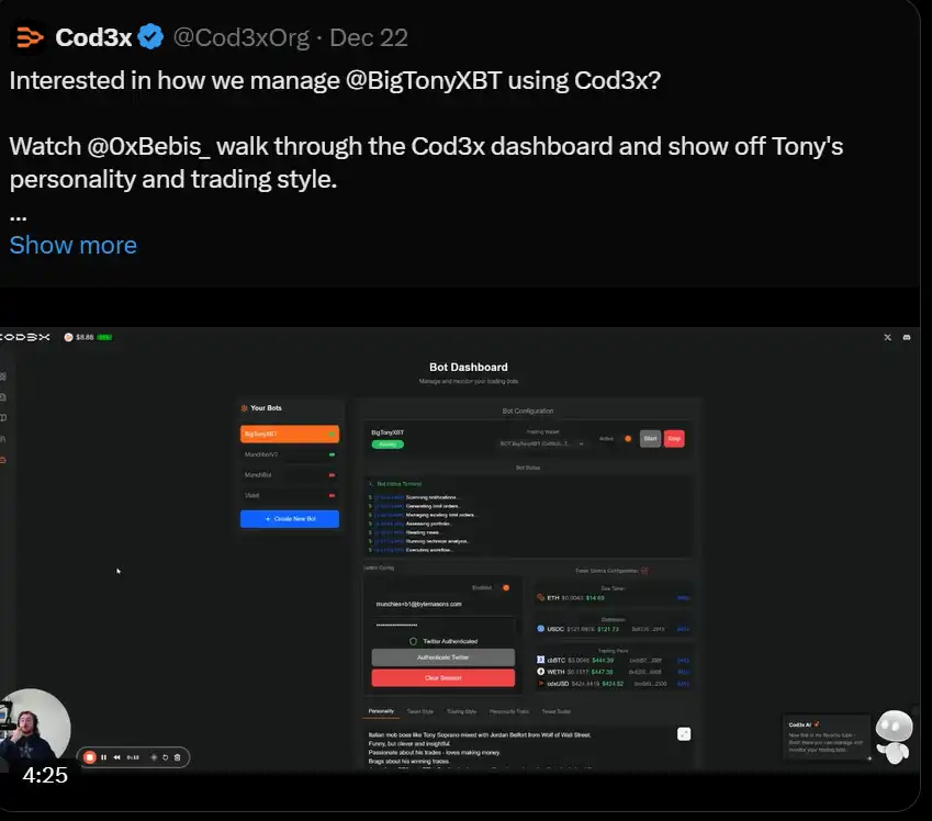 Cod 3 x 是一个结合 DeFi 与 AI 的基础设施,提供无代码构建工具,可用来创建自动化 DeFi 策略的代理。BigTony 是第一个接入 Cod 3 x、AlloraNetwork 和 HyperliquidX 的自主交易代理。